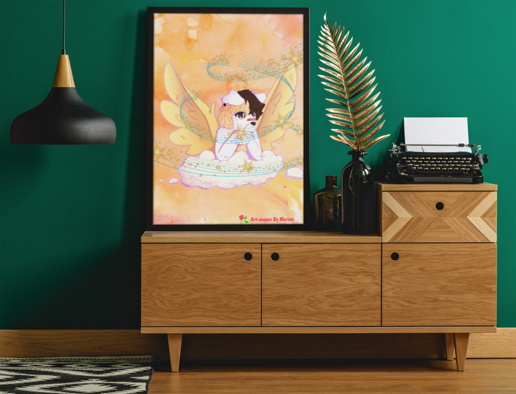 This digital art print depicts an anthropomorphic character, resembling a puppy with large yellow wings and a dark brown patch of fur, sitting on a cloud amidst a warm-toned watercolor background with star accents. The puppy dog has a white and tan face, with one yellow eye and one brown eye. The style is a soft, watercolor digital illustration with a whimsical tone. Perfect for animal lovers, pet owners and those who enjoy unique, whimsical art.
