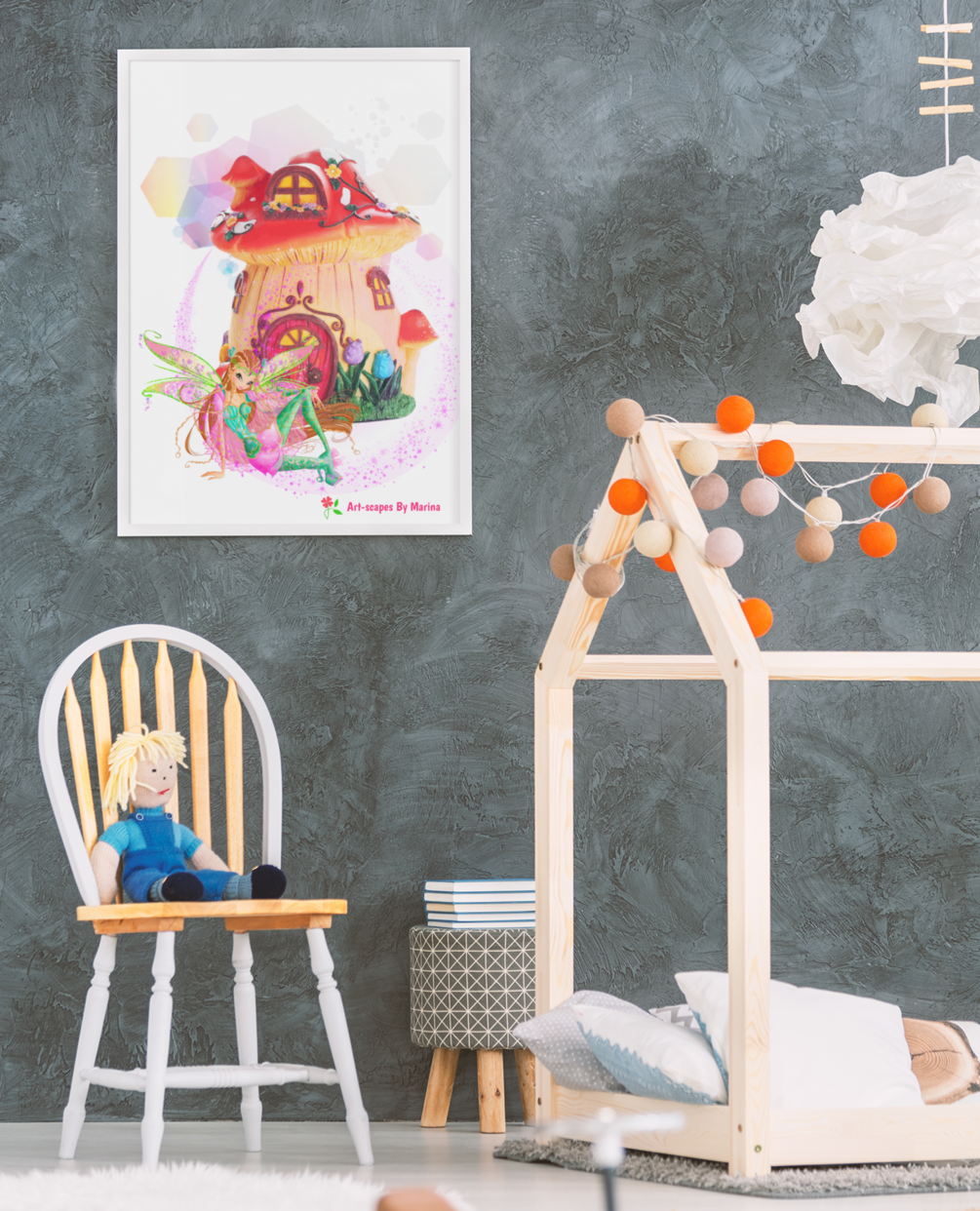 In the heart of a magical forest, there lies a Fairy tale, where the enchanting Mushroom House stands. This whimsical digital art print captures the essence of a mystical realm where fairies come to life and dance among the vibrant mushrooms. The artwork features a red mushroom cap roof with floral accents and a wooden door and tiny arched windows, surrounded by green grass and flowers in whimsical fairytale style, highly detailed, vibrant colors with a fairy in pink and green sitting in her enchanted garden with pink fairy dust sprinkled around her. The watercolor technique adds a dreamlike quality to the artwork, transporting you to a fantasy world of wonder and imagination of hidden hideaways filled with magical creatures. Let the Magical Mushroom Fairy House fill your space with a touch of magic and fantasy, reminding you of the beauty that lies within nature's hidden treasures. Perfect for Nursery room or playroom decor!