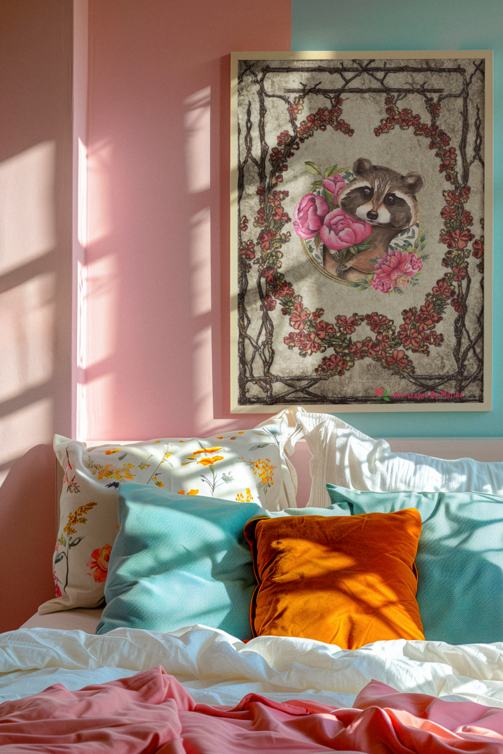 This decorative raccoon wall art print adds a touch of color to any environment and creates a unique atmosphere whether in a kid’s room, nursery room or any other space in the home or office reception. The digital print is a watercolor featuring a raccoon surrounded by red flowers and is holding vintage pink roses with an ornate, branch-like border, while its black mask and beady eyes add a touch of whimsy. Perfect gift for a Veterinarian, great gift for someone who loves nature and animals, perfect gift for a friend, Antique lover and Retro lover.