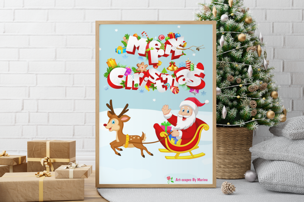 Celebrate the festive season with this charming Christmas Wall Poster Print, featuring Santa Claus in his sleigh being pulled by Rudolph the red nosed Reindeer over a snowy landscape. The words "Merry Christmas" are written in a large, decorative font. The background is a light blue with snowflakes. Designed for Festive décor enthusiasts. This printable wall art makes a cheerful addition to your living room, entryway, or holiday display.