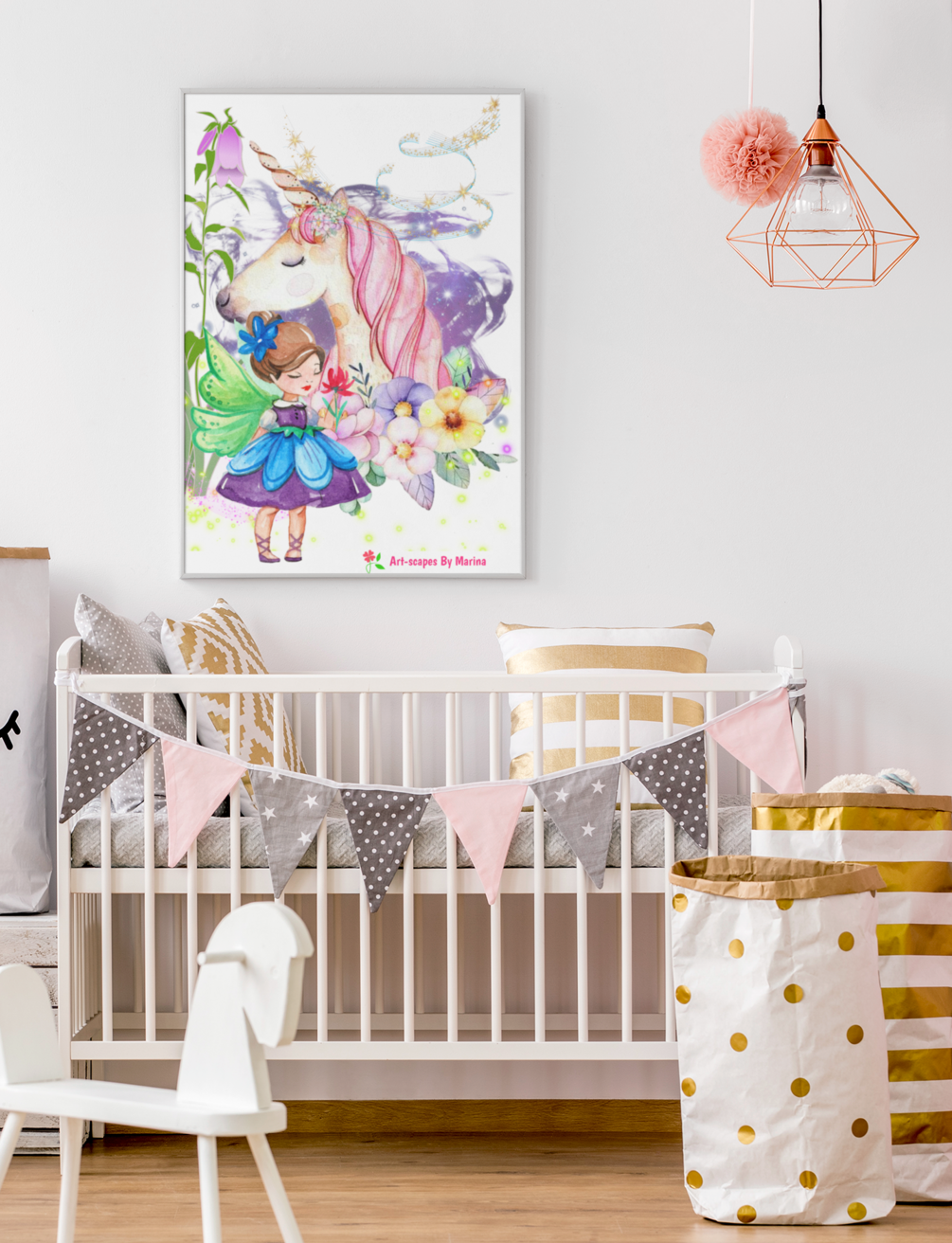 Watercolor Unicorn And Fairy Wall Art Print : Whimsical Themes Décor (Digital Download)